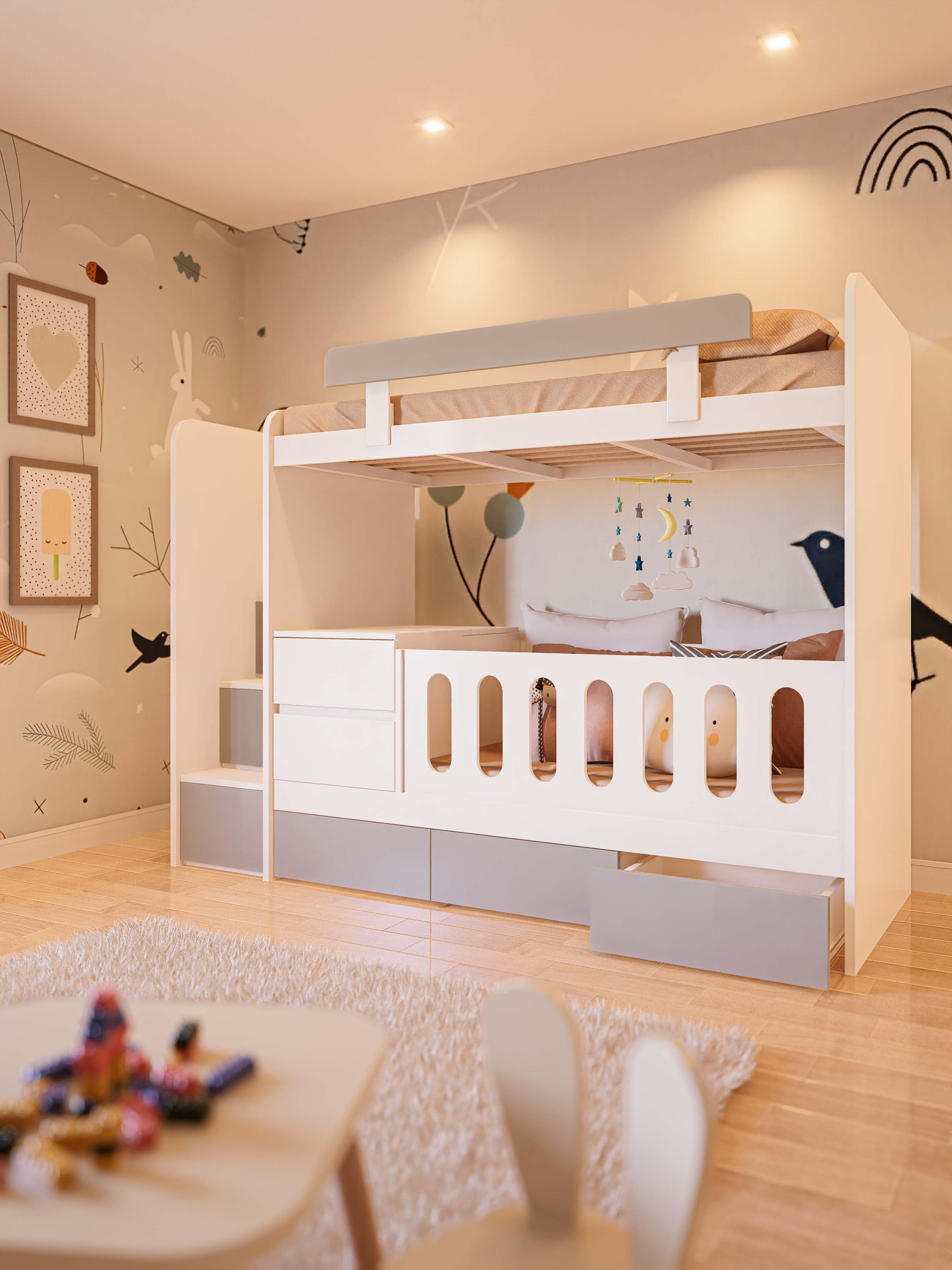 Su diseño moderno en blanco con detalles en colores pastel aporta calidez y armonía al ambiente infantil.